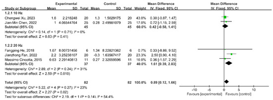 In different stimulation frequencies, the research results demonstrated a statistically significant enhancement in CRS-R scores following the administration of the 20 Hz rTMS intervention (WMD = 1.61; 95% CI: 0.39–2.83; p = 0.010; I2 = 31%); however, there was no significant change in the 10 Hz rTMS intervention (WMD = 0.42; 95% CI: −0.58–1.41; p = 0.41; I2 = 0%) (Figure 5).