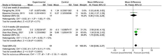 In different stimulation durations, the results reported that 20 sessions during 4 weeks of rTMS intervention significantly improved CRS-R scores (WMD = 1.75; 95% CI: 0.95–2.55; p < 0.0001; I2 = 12%); however, there were no significant changes in the CRS-R scores of five sessions (WMD = 0.36; 95% CI: −1.53–2.24; p = 0.71; I2 = 0%) of the rTMS intervention (Figure 6).