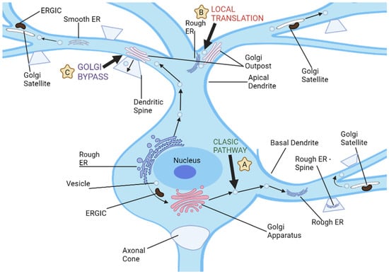Cerebral cells, comprising neurons and glia, are characterized by intricate architectures tailored to execute designated roles. Neurons establish synapses to facilitate electrical communication, oligodendrocytes envelop axons with myelin sheaths for insulating properties, and astrocytes bridge vascular networks [6,7]. These specialized morphologies necessitate distinct routes for protein trafficking, prominently featuring the Golgi apparatus outposts (GOPs) (Figure 1). In specialized cellular contexts, Golgi outposts assume critical functions essential for the sculpting of distinct cellular morphologies and architectures. Notably, within neurons, these organelles are pivotal for the formation of dendritic branches [8]. Concurrently, in muscle cells, they are implicated in the genesis of grid-like microtubule lattices, and in oligodendrocytes, they facilitate the formation of microtubules that encircle the myelin sheath in a spiral configuration [9]. Intriguingly, notwithstanding their crucial roles, to date, Golgi outposts have been exclusively identified in vivo and within primary cultured cells, evading detection in immortalized cell lines [10].