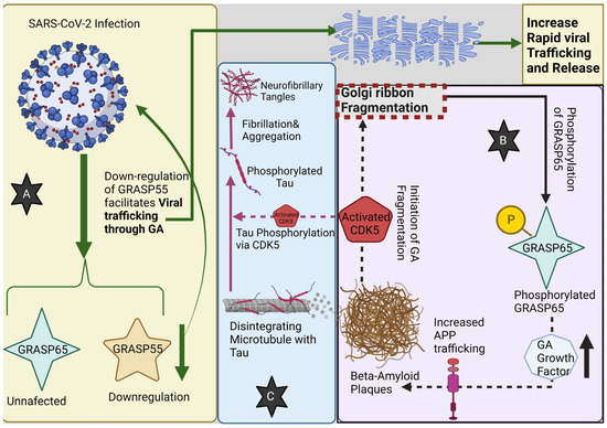 (A) SARS-CoV-2 infection down-regulates GRASP55, whereas GRASP65 remains unaffected. Down-regulation of GRASP55 facilitates viral trafficking through the Golgi apparatus (GA) leading to its fragmentation; GA fragmentation then leads to a rapid increase in viral trafficking and release. (B) Beta-amyloid plaques lead to GA fragmentation, through CDK5 activation, that in turn increases the phosphorylation of GRASP65, which will stimulate the GA growth factor synthesis and release, contributing to more APP (Amyloid Precursor Protein) trafficking, increasing the beta-amyloid plaque formation from Aβ oligomers. (C) Moreover, the activation of CDK5 contributes to Tau protein phosphorylation, thus promoting its fibrillation and aggregation into neurofibrillary tangles.
