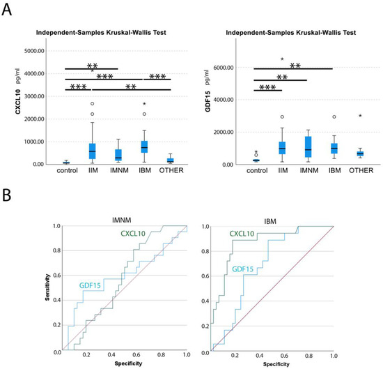 Levels of CXCL10 and GDF15 were not correlated in any of the sera from all diagnostic groups. ROC analysis found AUCs for CXCL10 were 0.573 for IMNM and 0.870 for IBM, and 0.879 for the whole group of IIMs. With the threshold set to 180 pg/mL of CXCL10, myositis patients could be differentiated from healthy and disease controls with a sensitivity of 0.80 and a specificity of 0.71. For GDF15, AUC were 0.596 for IMNM and 0.688 for IBM, and 0.772 in combined IIMs.