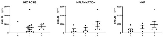 The pattern of myopathological changes differed between IMNM and IBM patients (Supplementary Table S4). IMNM was associated with muscle fiber necrosis and less severe inflammatory damage, while IBM was strongly associated with endomysial buildup of inflammation and active invasion of non-necrotic muscle fibers by auto-aggressive immune cells. In IBM tissues, a subset of inflammatory cells were CXCL10-positive, notably immune cells invading non-necrotic muscle fibers, of which most were CD68-positive (Figure 2E,F). The severity of inflammatory changes in individual IIM patients tended to be associated with circulating levels of CXCL10 (Figure 3), though no significance was shown in this smaller patient sample.