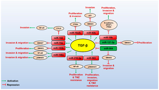Liu et al. observed a significant positive correlation between the expression of miR-10a/b and TGF-β in glioma tissues [83]. miR-10a/10b is induced upon TGF-β treatment of U251 and SHG-44 cells [83]. miR-10a/10b overexpression significantly increased the migration of U251 cells [83]. Bioinformatics analysis and luciferase reporter assay revealed that PTEN, an important tumour suppressor gene, is a primary target of miR-10a/10b [83]. Also, overexpression of miR-10a/10b reduced the expression of PTEN, while depletion of miR-10a/10b displayed the reverse effect. These results indicate that miR-10a/10b, upon induction by TGF-β, promotes GBM pathogenesis by inhibiting PTEN [83].