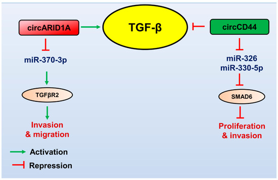 Li et al., using microarray analysis, identified differentially expressed circular RNAs in GBM tumour tissues [101]. CircARID1A was highly abundant in GBM samples and GBM cell lines and was also present in the blood exosomes of GBM patients [101]. shRNA-mediated knockdown of circARID1A attenuated the migration and invasion of GBM cells [101]. Also, MMP 2, MMP 9, and MMP 14 were downregulated upon circARID1A knockdown, indicating that circARID1A promotes GBM cell migration and invasion [101]. Bioinformatic analysis revealed that cicrARID1A interacts with miR-370-3p [101]. FISH experiments demonstrated the co-localization of circARID1A and miR-370-3p in the cytoplasm [101]. Dual luciferase reporter assay with the plasmid containing miR-370-3p binding sites of circARID1A, co-transfected with miR-370-3p mimics, significantly reduced the luciferase reporter activity [101]. These results suggest a direct interaction between cicrARID1A and miR-370-3p [101]. miR-370-3p expression is downregulated in GBM tissue compared to normal brain tissues [101]. Bioinformatics analysis and luciferase reporter assay showed that TGFBR2 is an essential target of miR-370-3p [101]. RNA pulldown assay with biotin-labelled miR-370-3p in U87 cells showed enrichment of TGFBR2 and circARID1A, indicating the possibility of circARID1A/miR-370-3p/TGFBR2 axis in GBM [101]. Further, silencing miR-370-3p increased the invasion of GBM cells [101]. Also, the knockdown of circARID1A attenuated TGFBR2 levels [101]. miR-370-3p inhibition promoted TGFBR2 protein levels, which was reversed upon combined knockdown of miR-370-3p and circARID1A [101]. GBM cell invasion and migration increased upon miR-370-3p inhibition, which was reversed upon combined knockdown of miR-370-3p and circARID1A [101]. Further, in vivo, the xenograft tumour model indicated reduced tumour growth and reduced TGFBR2 protein levels upon circARID1A knockdown. Thus, circARID1A promotes GBM invasion by sponging miR-370-3p to stabilize TGFBR2 [101].