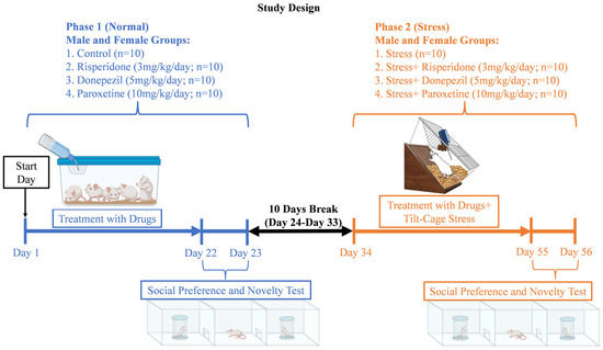 The study duration was 56 days (Figure 1). It was divided into two phases, i.e., phase 1 (21 days of drugs treatment) and phase 2 (21 days of drugs treatment with tilt-cage stress). A gap of 10 days, with normal food and water, was provided between the two phases to ensure the removal of the drugs from the body (Figure 1). The treatment was conducted in such a way that each group received its own specific drugs during both phases (1 and 2).