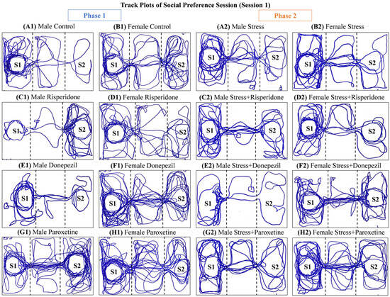 Track plots of One Representative Animal from Each Group during Social Preference Session (Session 1). The plots are of (Phase 1) (A1) Male Control Group, (B1) Female Control Group, (C1) Male Risperidone (3 mg/kg/day) Group, (D1) Female Risperidone (3 mg/kg/day) Group, (E1) Male Donepezil (5 mg/kg/day) Group, (F1) Female Donepezil (5 mg/kg/day) Group, (G1) Male Paroxetine (10 mg/kg/day) Group, and (H1) Female Paroxetine (10 mg/kg/day) Group, and (Phase 2) (A2) Male Stress Group, (B2) Female Stress Group, (C2) Male Stress + Risperidone (3 mg/kg/day) Group, (D2) Female Stress + Risperidone (3 mg/kg/day) Group, (E2) Male Stress + Donepezil (5 mg/kg/day) Group, (F2) Female Stress + Donepezil (5 mg/kg/day) Group, (G2) Male Stress + Paroxetine (10 mg/kg/day) Group, and (H2) Female Stress + Paroxetine (10 mg/kg/day) Group.