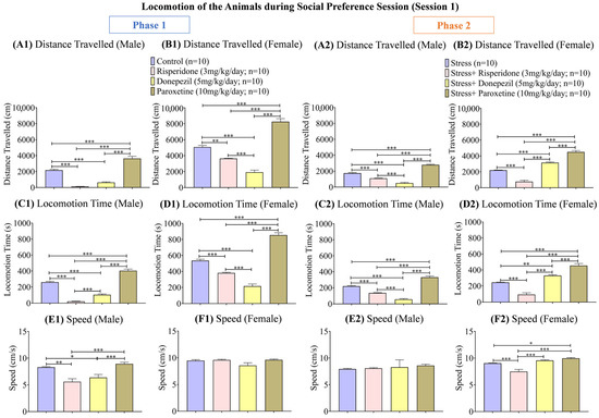 Locomotion of the Animals during Social Preference Session (Session 1). The graphs present a comparison of (Phase 1) (A1) Distance Traveled (Male), (B1) Distance Traveled (Female), (C1) Locomotion Time (Male), (D1) Locomotion Time (Female), (E1) Speed (Male), and (F1) Speed (Female) among the Control, Risperidone (3 mg/kg/day), Donepezil (5 mg/kg/day) and Paroxetine (10 mg/kg/day) groups, and (Phase 2) (A2) Distance Traveled (Male), (B2) Distance Traveled (Female), (C2) Locomotion Time (Male), (D2) Locomotion Time (Female), (E2) Speed (Male), and (F2) Speed (Female) among the Stress, Stress + Risperidone (3 mg/kg/day), Stress + Donepezil (5 mg/kg/day) and Stress + Paroxetine (10 mg/kg/day) groups. Statistical significance was determined by one-way ANOVA followed by Tukey’s post hoc test. The significant values are denoted as * = p < 0.05, ** = p < 0.01, *** = p < 0.001 while the error bars are represented as mean ± SEM.