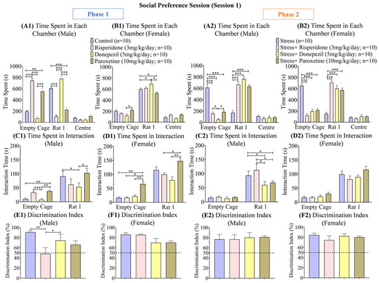 Social Preference Session (Session 1). The graphs present a comparison of Phase 1 (A1) Time Spent in Each Chamber (Male), (B1) Time Spent in Each Chamber (Female), (C1) Time Spent in Interaction (Male), (D1) Time Spent in Interaction (Female), (E1) Discrimination Index (Male), and (F1) Discrimination Index (Female) among the Control, Risperidone (3 mg/kg/day), Donepezil (5 mg/kg/day) and Paroxetine (10 mg/kg/day) groups, and (Phase 2) (A2) Time Spent in Each Chamber (Male), (B2) Time Spent in Each Chamber (Female), (C2) Time Spent in Interaction (Male), (D2) Time Spent in Interaction (Female), (E2) Discrimination Index (Male), and (F2) Discrimination Index (Female) among the Stress, Stress + Risperidone (3 mg/kg/day), Stress + Donepezil (5 mg/kg/day) and Stress + Paroxetine (10 mg/kg/day) groups. Statistical significance was determined by two-way and one-way ANOVAs followed by Tukey’s post hoc test. The significant values are denoted as * = p < 0.05, ** = p < 0.01, *** = p < 0.001 while the error bars are represented as mean ± SEM.