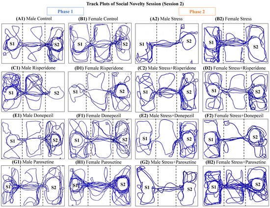 Track plots of One Representative Animal from Each Group during Social Novelty Session (Session 2). The plots are of (Phase 1) (A1) Male Control Group, (B1) Female Control Group, (C1) Male Risperidone (3 mg/kg/day) Group, (D1) Female Risperidone (3 mg/kg/day) Group, (E1) Male Donepezil (5 mg/kg/day) Group, (F1) Female Donepezil (5 mg/kg/day) Group, (G1) Male Paroxetine (10 mg/kg/day) Group, and (H1) Female Paroxetine (10 mg/kg/day) Group, and (Phase 2) (A2) Male Stress Group, (B2) Female Stress Group, (C2) Male Stress + Risperidone (3 mg/kg/day) Group, (D2) Female Stress + Risperidone (3 mg/kg/day) Group, (E2) Male Stress + Donepezil (5 mg/kg/day) Group, (F2) Female Stress + Donepezil (5 mg/kg/day) Group, (G2) Male Stress + Paroxetine (10 mg/kg/day) Group, and (H2) Female Stress + Paroxetine (10 mg/kg/day) Group.