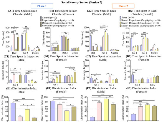 Social Novelty Session (Session 2). The graphs present a comparison of (Phase 1) (A1) Time Spent in Each Chamber (Male), (B1) Time Spent in Each Chamber (Female), (C1) Time Spent in Interaction (Male), (D1) Time Spent in Interaction (Female), (E1) Discrimination Index (Male), and (F1) Discrimination Index (Female) among the Control, Risperidone (3 mg/kg/day), Donepezil (5 mg/kg/day) and Paroxetine (10 mg/kg/day) groups, and (Phase 2) (A2) Time Spent in Each Chamber (Male), (B2) Time Spent in Each Chamber (Female), (C2) Time Spent in Interaction (Male), (D2) Time Spent in Interaction (Female), (E2) Discrimination Index (Male), and (F2) Discrimination Index (Female) among the Stress, Stress + Risperidone (3 mg/kg/day), Stress + Donepezil (5 mg/kg/day) and Stress + Paroxetine (10 mg/kg/day) groups. Statistical significance was determined by two-way and one-way ANOVAs followed by Tukey’s post hoc test. The significant values are denoted as * = p < 0.05, ** = p < 0.01, *** = p < 0.001 while the error bars are represented as mean ± SEM.