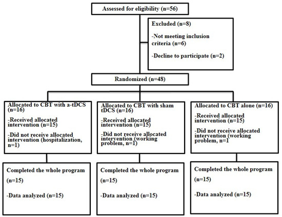 All patients provided written informed consent before inclusion in this study. This study conforms to the consort checklist criteria. Eligible individuals were randomly based on computer coding assigned into three groups: (1) concurrent left DLPFC c-tDCS and CBT (experimental group); (2) concurrent sham c-tDCS and CBT (sham stimulation group); (3) CBT alone (control group).