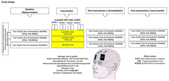 Therefore, in keeping with the reviewed studies, this study aimed to investigate the short-term and lasting effects of concurrent CBT and c-tDCS over the DLPFC on pain, pain-related anxiety, and fear of movements in patients with LBP with high pain-related anxiety. We hypothesized the following: