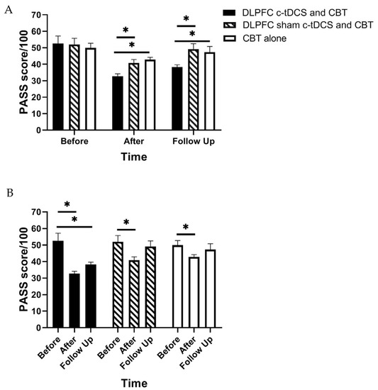 (A) The comparison of the Pain Anxiety Symptoms Scale (PASS) scores (mean ± SEM) before, immediately after, and one month after the intervention in DLPFC c-tDCS concurrent with CBT, sham DLPFC c-tDCS concurrent with CBT, and CBT alone groups; * indicates the significant differences in PASS score after intervention between groups. (B) The comparison of the Pain Anxiety Symptoms Scale (PASS) scores (mean ± SEM) before, immediately after, and one month after the intervention in each group; * indicates the significant differences in PASS score after intervention rather than baseline in each group.