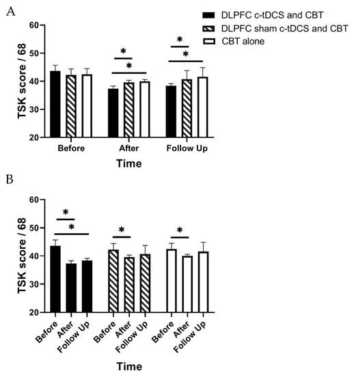(A) The comparison of the Tampa Scale for Kinesiophobia (TSK) scores (mean ± SEM) before, immediately after, and one month after the intervention in DLPFC c-tDCS concurrent with CBT, sham DLPFC c-tDCS concurrent with CBT, and CBT alone groups; * indicates the significant differences in TSK score after intervention between groups. (B) The comparison of the Tampa Scale for Kinesiophobia (TSK) scores (mean ± SEM) before, immediately after, and one month after the intervention in each group; * indicates the significant differences in TSK score after intervention rather than baseline in each group.