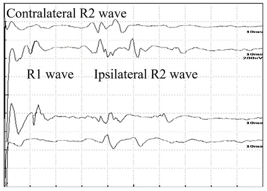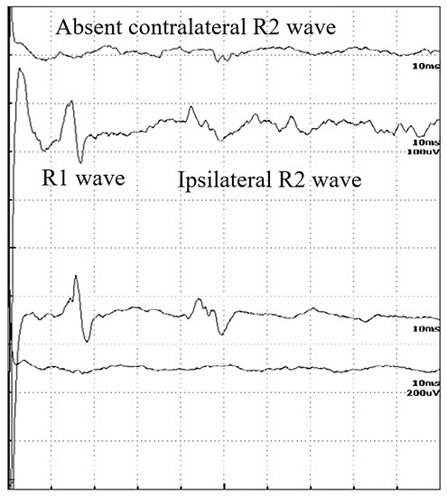 In Table 2, the p-values are summarized, where the latencies of the R waves in different diseases are compared to healthy subjects. In Bell’s paresis, as can be expected, the latencies of R1, ipsilateral R2i, and contralateral R2c are increased. In myasthenia gravis and diabetic polyneuropathy, all R-wave latencies are longer, but in ALS, only the R2i and R2c values differ significantly. Therefore, the difference between ALS and the other examined diseases was the normal R1 (Table 2). Four patients with ALS were hospitalized at a later stage of the disease. Their contralateral R2 waves had completely disappeared and, therefore, could not be quantified (Figure 2). It is also important to study the absent responses. In ALS patients, the absent R2c responses may show the importance of interneurons.