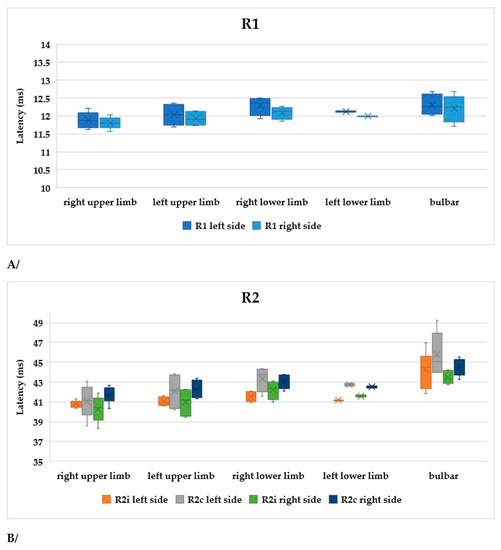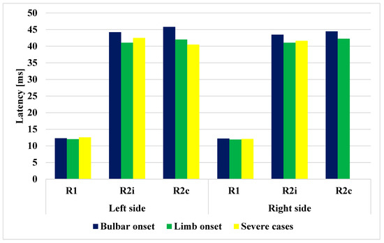 In consequence of the various methodological approaches and laboratory environments, as well as the different measuring systems assessed, different laboratories might have accepted disparate standard values for the latencies of R1, R2i, and R2c. Conducting studies of the BR, the authors limited control groups and, as a result, different R1, R2i, and R2c components arose. In view of the above, we also established our laboratory-specific values for the R1 and R2 parameters that could be used in our studies prior to examining subjects with suspected ALS. For this purpose, we enrolled 50 healthy volunteers, aged 22 to 75 years (23 female and 27 male subjects; median age = 50 years), who had no history of any central or peripheral nerve diseases. Additionally, Bell’s paresis (N = 27) (left, right), myasthenia gravis (ocular, generalized) (N = 9), and diabetic polyneuropathy groups (N = 25) were also examined for comparison purposes (total N = 61). Since laboratory-specific control R1 and R2 parameters were available, subjects with ALS were examined to obtain their R1, R2i, and R2c components. BR parameters were considered pathological if the value was outside the 95th percentile for healthy controls. The values were as follows: R1 left 12.3 ms, R2i 36.44 ms, R2c 36.65 ms, R1 right 12.28 ms, R2c 36.28 ms, R2c 37.13 ms.
