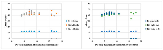 If the R latencies of BR are examined in the light of disease duration from onset until examination, a positive correlation can be detected with Spearman’s rank test: ρ = 0.5, p = 0.007; ρ = 0.18, p = 0.25; ρ = 0.02, p = 0.39; ρ = 0.35, p = 0.07; ρ = −0.18, p = 0.25; and ρ = −0.47, p = 0.01 by the latencies of R1 left, R2i left, R2c left, R1 right, R2i right, and R2c right, respectively (Figure 5). Despite significant correlations, the r values are low, so cautious interpretation is required.
