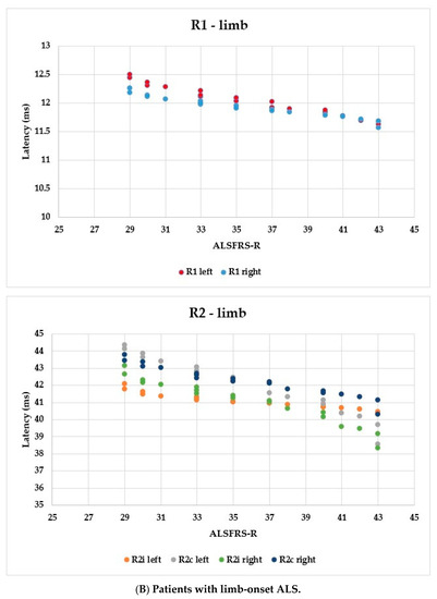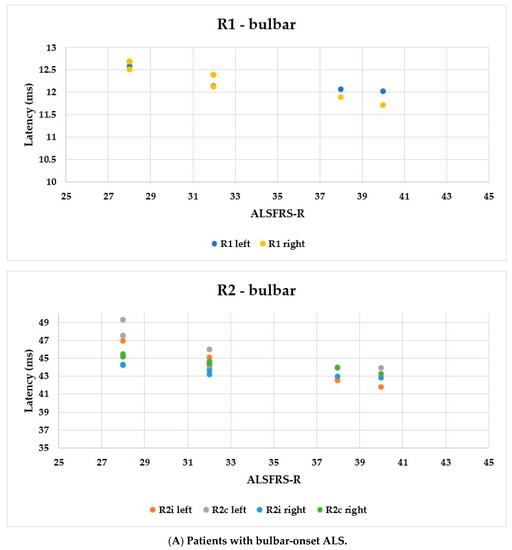 Using the ALSFRS-R score, better evaluation of the functional status could be achieved; therefore, we used this as a comparison for the R1, R2i, and R2c latencies. In Figure 6, each patient’s BR parameters are shown according to their ALSFRS-R status: longer R2 parameters were observed, while R1 was the same in both the bulbar-onset (Figure 6A) and limb-onset (Figure 6B) groups. Spearman’s rank correlation was computed to assess the relationship between ALSFRS-R and BR latencies, and there was a negative correlation between the variables. In all patients with ALS, ρ = −0.95, p < 0.0001; ρ = −0.61, p = 0.001; ρ = −0.82, p < 0.0001; ρ = −0.90, p < 0.0001; ρ = −0.83, p < 0.0001; and ρ = −0.80, p < 0.0001 by the latencies of R1 left, R2i left, R2c left, R1 right, R2i right, and R2c right, respectively. Among patients with bulbar onset, ρ = −0.90, p = 0.005; ρ = −0.93, p = 0.002; ρ = −0.84, p = 0.017; ρ = −0.96, p = 0.0008; ρ = −0.94, p = 0.002; and ρ = −0.97, p = 0.0004 by the latencies of R1 left, R2i left, R2c left, R1 right, R2i right, and R2c right, respectively. In patients with limb onset, ρ = −0.99, p < 0.0001; ρ = −0.96, p < 0.0001; ρ = −0.98, p < 0.0001; ρ = −0.98, p < 0.0001; ρ = −0.97, p < 0.0001; and ρ = −0.97, p < 0.0001 by the latencies of R1 left, R2i left, R2c left, R1 right, R2i right, and R2c right, respectively.