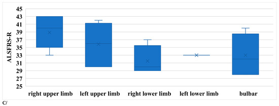 Amyotrophic Lateral Sclerosis Functional Rating Scale—Revised (ALSFRS-R) scores [28,29] were used to assess functional status. Groups were formed according to the onset symptoms: bulbar onset, or limb onset. The two groups were formed according to their onset symptoms. At the time of the examination, it might have occurred that the patient had additional symptoms clinically or subclinically detected by neurophysiological examinations, while also fulfilling the Awaji criteria. A severe group of 4 patients was examined separately, where at the time of the examination the symptoms were very severe and the onset could not be clarified.