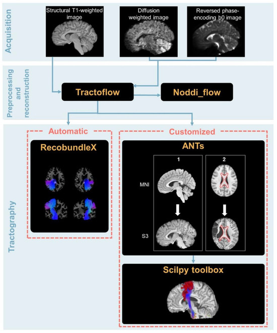Data preprocessing and correction were performed with the Tractoflow version 2.3.0 pipeline (code available at https://github.com/scilus/tractoflow.git [40]), which is based on other existing tools such as Diffusion Imaging for Python library version 1.5.0 (DIPY; [43]), FMRIB software library 6.0 (FSL; http://fsl.fmrib.ox.ac.uk/fsl/fslwiki/, accessed on 1 September 2022; Oxford, UK; [44]), MRtrix3 (https://www.mrtrix.org/, accessed on 1 September 2022; [45]), Advanced Normalization Toolbox 2.4.1 [46] and containers such as Nextflow and Singularity to improve reproducibility [47,48]. The -bundling profile option was used for its robustness with challenging data such as big lesions, which usually hinder the T1 segmentation. This option consists of activating tailored settings for tracking. Since the script was launched on a high-performance computer, the -fully_reproducible option was also set to maximize the reproducibility of the results by allowing multi-thread task execution without diminishing analysis quality. Both options were activated for all participants. For a graphical representation of the overall pipeline, see Figure 1.