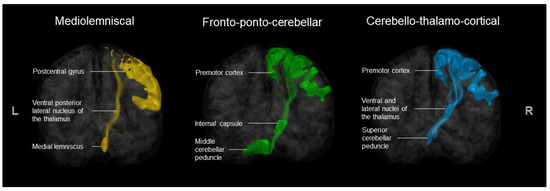 The tractograms were extracted with scil_filter_tractogram.py between our ROIs from en-semble tracking, using “any” and “include” parameters. For FPC tracts, ROI 1 was the premotor cortex, ROI 2 was the homolateral cerebral peduncle, and ROI 3 was the contra-lateral MCP. We excluded tracts passing through the CC and/or the contralateral internal capsule. For CTF tracts, ROI 1 was the SCP, ROI 2 was a fusion of ventral and lateral nuclei of the contralateral thalamus, and ROI 3 was the contralateral premotor cortex. We ex-cluded tracts ending in motor and sensorimotor cortices. To extract ML pathways, ROI 1 was the medial lemniscus, ROI 2 was the ipsilateral ventral posterior lateral nucleus of the thalamus, and ROI 3 was the ipsilateral postcentral gyrus.