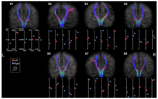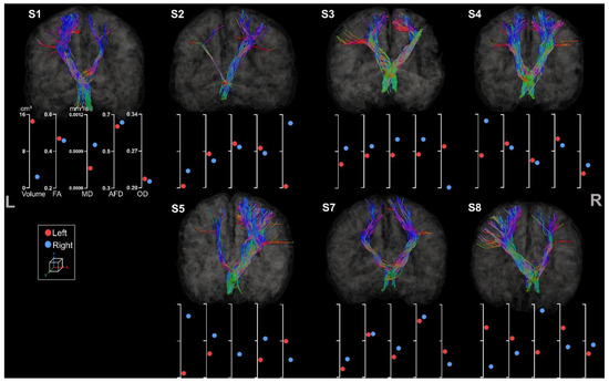 Asymmetry of volumes and diffusion metrics is less obvious than CC and CST section results as FPC tracts are not lateralized. Hence, some participants, including S3, S4, and S7, showed greater volume for the FPC located in the ipsilesional hemisphere.