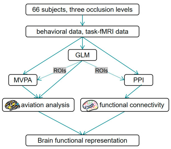 The excellent spatial resolution of fMRI can assist us in studying subtle changes in specific brain regions during the task state [17]. Generalized linear model (GLM) analysis is a flexible and powerful method for analyzing complex brain signal data, enabling the identification of specific brain activation regions related to a given task [18]. For the specific brain regions resulting from the GLM analysis, their statistical significance differences can be further investigated using the multivariate pattern analysis (MVPA) [19]. Psychophysiological interaction (PPI) analysis is to further investigate the functional connectivity between these specific brain regions [20]. Figure 1 presents the roadmap of the whole study.