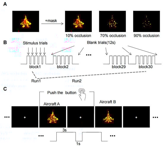 The fMRI experimental paradigm. (A) Occlusion Image Set. Aircraft targets undergo three levels of occlusion to generate an image set. (B) The whole process of MRI scans. Three types of occlusion image stimuli (10%, 70%, and 90%) were randomly presented in 10 blocks in each run. (C) Task operations in each trail. Subjects must make a decision within a 4-s window when the object is displayed and indicate their choice by pressing a button.