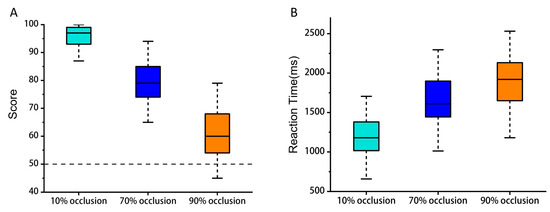 For the object recognition tasks, the average accuracy at occlusion levels of 10%, 70%, and 90% stood at 96%, 79%, and 62%, respectively (Figure 3A). The average reaction times were 1.23 s, 1.65 s, and 1.89 s, respectively (Figure 3B). We tested the significance of the difference between each of the two occlusion levels using a two-sample t-test under the FDR correction condition. These figures indicated that there were significant disparities in participants’ performance both regarding the accuracy and reaction time (FDR, two-sample t-test: p < 0.001), which amplified as the degree of occlusion rose.