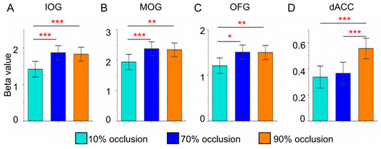 To visualize and further analyze the different levels of occlusion-dependent response, a region of interest (ROI) analysis was performed in this study. Referring to the GLM results acquired afore, occipital lobes and the dACC were chosen as the ROIs, and the Marsbar 0.45 toolbox was utilized to extract the mean Betas from them. The derived betas were then subjected to repeated-measures t-tests with FWE correction to underscore significantly different regional responses to varying occlusion levels.