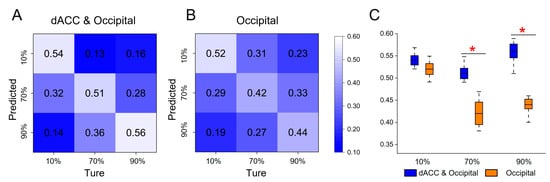 The results of multivariate pattern analysis. (A) Confusion matrix for classifying three types of occlusion image stimuli (taking both occipital and dACC brain activation as features). (B) Confusion matrix for the ablation experiment (randomly shuffling the dACC features). (C) Differences in accuracy between the above two classification experiments (baseline = 33%). (FDR, two-sample t-test: * = p < 0.05).