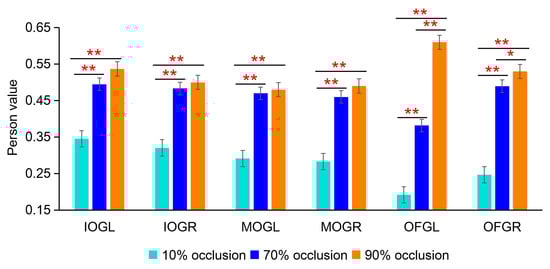 Functional connectivity (FC) refers to the meaningful interactions and communication between different brain regions, revealing the coordinated workings of the brain’s structure and function. To determine the correlation between the FC of the dACC and the occipital lobe with the occlusion level, we employed the generalized form of the PPI (gPPI) method [23,24], an approach ideally suited to scrutinizing FC during block-design experiments. Traditional PPI analysis is able to calculate functional connectivity for specific ROI between all voxels in the whole brain, while gPPI can calculate functional connectivity between two ROIs in different blocks. Based on whole-brain activation analysis findings, we selected bilateral occipital lobes (IOG, MOG, and OFG) and dACC as ROIs. For each participant, the ROIs’ time series were extracted using the first eigenvariate of a 6 mm radius sphere surrounding the peak (Table 1). At the individual participant level, the inclusion criteria were: (1) a psychological variable signifying the three occlusion levels; (2) a physiological variable of the ROIs; and (3) PPI values, the cross product of the first two regressors. To obtain FC values between the dACC and occipital lobes, we computed regression coefficients for the PPI values of the two relevant ROIs. Subsequently, we averaged the FC values between the dACC and six occipital lobes for each participant across all three tasks. This was followed by conducting a paired t-test on the averaged FC values between the dACC and occipital lobes. Because the PPI value benefits from the physiological variable (the first BOLD eigenvector), to demonstrate the reliability of the PPI value, we further calculated the Pearson correlation coefficient for the first BOLD eigenvector between the dACC and other occipital regions in different occlusion levels. We tested the significance of the difference between each of the two occlusion levels using a two-sample t-test under the FDR correction condition.