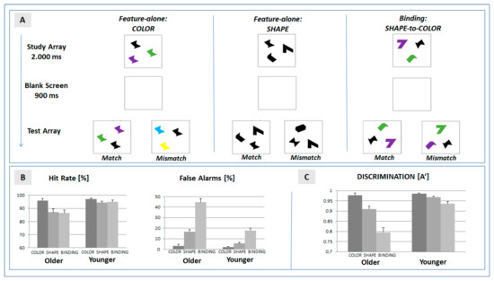 - Chalfonte, B.L.; Johnson, M.K. Feature memory and binding in young and older adults. Mem. Cognit. 1996, 24, 403–416. [Google Scholar] [CrossRef] [PubMed]
