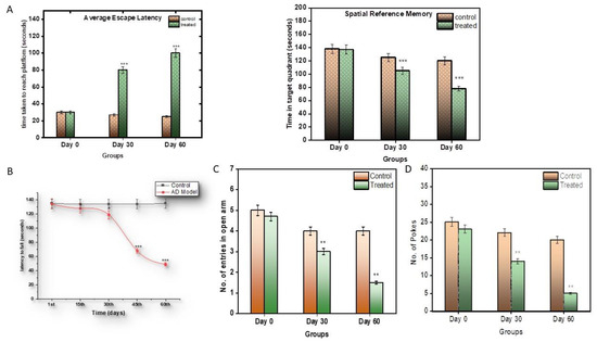 The Morris water maze test was conducted to analyse the memory and cognition of the control and treated subjects. Prior to the model development, all subjects were given similar training to find and climb the platform (Figure 1A).