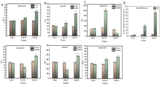 The data are expressed as mean +/− standard deviation. All the analysis was performed using Origin software 2020 v 2022. The comparison of the means of the control and the treated Wistar rats was carried out using a one-way ANOVA followed by the Tukey test, with * p < 0.0001 as the limit of significance.
