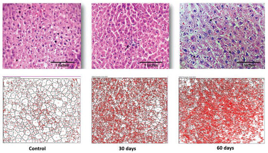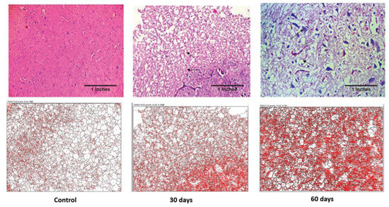 Histopathological and image analyses were performed on both the liver and the hypothalamus section of the brain. The brain section retrieved from the 2nd-month LOAD model showed deformed glial nodules and apoptotic neurons. It also showed occasional degenerated neurons and a few amyloid plaques. Amyloid plaques are hallmarks of AD. Severe vacuolization in this stage within the cell matrix is also an indication of cell death. Likewise, the 2nd-month liver section showed a mildly effaced lobular architecture, an oval nucleus with coarse chromatin and prominent nucleoli, and the extravasation of RBCs. The liver showed scars and signatures of a cirrhotic liver. Image analysis confirmed the decrease in cell size of both the neuronal cells and hepatocytes, which is an indication of cell death due to LOAD.
