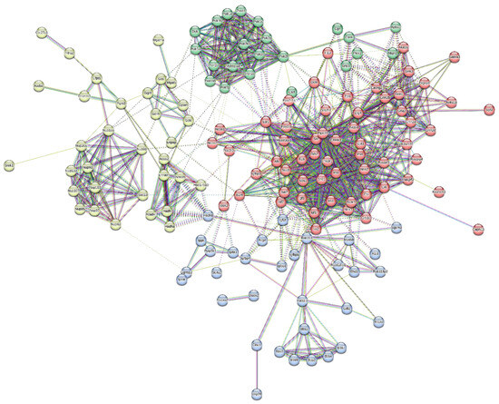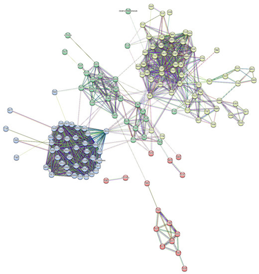 The dysregulated proteins observed in both the liver and brain tissues were investigated further for the construction of protein–protein interaction (PPIs) networks. The STRING database is a repository of all known/validated PPIs and also predicts the interaction between the protein nodes in a network based on genomic patterns such as co-occurrence, gene neighbourhoods, domain fusion, text mining, etc. Functional enrichment of the network was also performed, and later, k-means clustering was performed to cluster the dysregulated genes according to the similarities of their biological pathways.