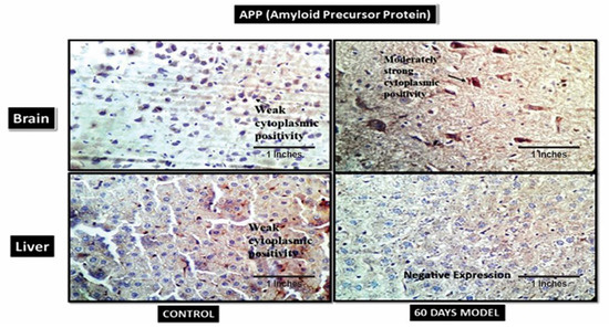 The IHC showed weak cytoplasmic APP in the control brain (Figure 10), while the sporadic AD (60th-day) brain had moderately strong cytoplasmic positivity. A few amyloid plaques can be seen in the background. Likewise, in liver sections, the control had low cytoplasmic positivity, but the 60th-day sporadic AD liver had negative APP expression. The liver is the site of amyloid clearance in body and, therefore, since the liver was dysfunctional, it was observed that it was unable to clear APP from the body, and, therefore, had negative expression in the AD model.