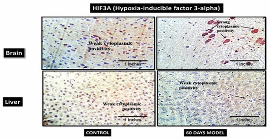 HIF3A works during hypoxic conditions. The IHC showed weak cytoplasmic positivity for HIF3A in the control brain section, while the diseased brain showed very strong cytoplasmic positivity (Figure 11). However, in the liver section, both the control and diseased states showed weak cytoplasmic activity.