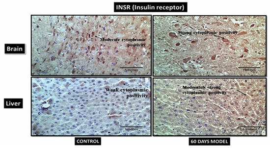 Photomicrographs of IHC images of hypothalamus section of brain and liver tissue sections of Wistar rats showing control and diseased sections stained with INSR antibody (400×).