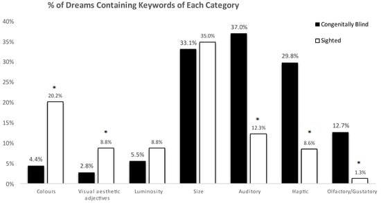 Statistical analysis was conducted with the Statistical Package for the Social Sciences (SPSS) Statistics 26 (IBM Corp., New York, NY, USA). A chi-square test for independence was calculated comparing the occurrence of each keyword’s frequency, for each category, between the dreams of the congenitally blind and those of the normally sighted controls (Figure 1; Table S1).