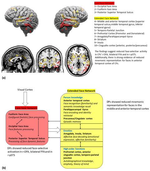 The behavioral deficits in DPs have been strictly linked to the FFA white and grey matter abnormalities, as demonstrated by reduced face-selective activity in both the OFA and FFA. Indeed, although OFA gray matter seems not to be affected, the disrupted functional connectivity between the OFA and FFA could contribute to the normal reconstruction of individual facial features in a holistically integrated configuration, resulting in more feature-based processing [70,152,153]. Furthermore, the disrupted functional connectivity between the FFA and pSTS might contribute to the compromised static and dynamic integration of facial features.