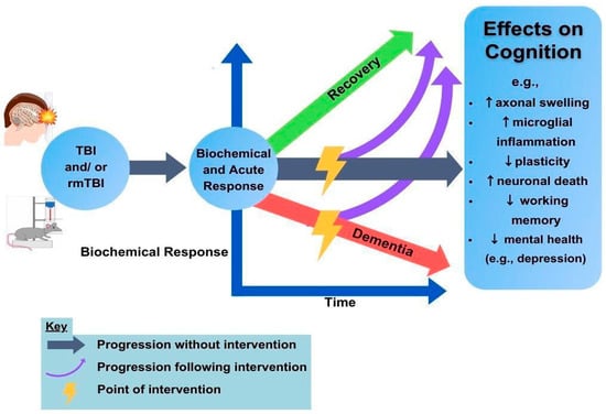 CTE is a degenerative disease linked to rmTBI, especially in high-contact sports athletes [61]. CTE is characterized by loss of the cognitive control required for WM and attention, and neurobiologically, with cell loss and large accumulations of pTau in neurofibrillary and astrocytic tangles [21,62,63,64]. These changes are likely due to axonal injury and exacerbated by impaired ability to repair damage and clear debris [65], resulting in aggressive neurodegeneration. However, even without CTE, the downstream pathological response to rmTBI is related to other degenerative diseases and could be a contributing factor to future disease development. Researchers must uncover reliable biomarkers to determine if this mechanism can be modulated by neurostimulation [66]. Biochemical research in animal models will improve our overall understanding of this transition and focus the search for predictive biomarkers.