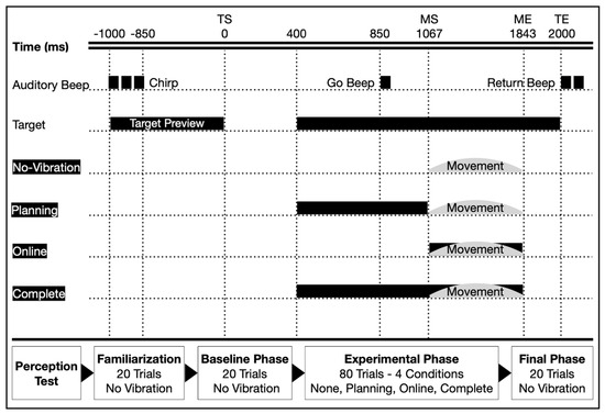 Figure 2. Depiction of a single trial in all four experimental conditions. At the top of the figure, the time scale reflects the chirp, target preview, trial start (TS) and end (TE), target/go-beep/return-beep, and movement start (MS) and end (ME). The figure contains the onset and offset of vibration in the no-vibration trials (i.e., Baseline, None, Final), as well as in the Planning, Online, and Complete vibration conditions represented by the black bars. The time values are grand averages across all participants and conditions. The bottom of the figure illustrates the experimental protocol and trial breakdown in its entirety.
