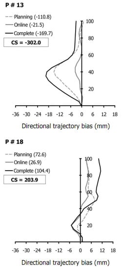 Figure 3. The individual directional trajectory biases ( D B   x ¯ ) as a function of the main conditions (i.e., Planning, Online, and Complete). Lines of graphs represent the participants’ average biases—for all trials—in the Planning (grey dashed), Online (grey solid), and Complete condition (black solid). Values in parentheses indicate D B   x ¯ for each condition. Negative CS represents individual composite score for the leftward bias (for one participant), whereas positive CS represents individual composite score for the rightward bias (for one participant).