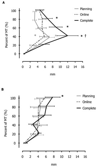 Figure 4. The absolute values of the mean directional trajectory biases ( D B   x ¯ ) at each 20% of MT as a function of the main conditions (i.e., Planning, Online, and Complete) for the Leftward group (Panel A) and Rightward group (Panel B), respectively. Error bars represent SEM. Asterisks (*) denote significant differences within each condition with respect to the movement start. Asterisks (†) denote significant differences between Complete and Online conditions at 40% of MT.