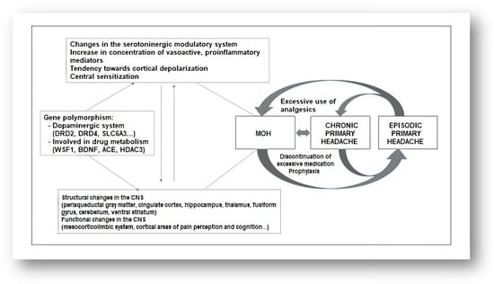 Genetic studies suggest the possible importance of polymorphisms in genes related to the dopaminergic system (DRD4, DRD2, and SLC6A3) and genes involved in the neurobiology of the addiction syndrome (WSF1, BDNF, ACE, and HDAC3) [11] (Figure 1). Central sensitization plays a key role in the pathophysiology of chronic migraine [44]. Analysis of somatosensory evoked potentials has shown that patients with chronic migraine have cortical hyperexcitability compared to healthy controls and patients with episodic migraine [45,46]. A follow-up study has observed that central sensitization is reduced with the cessation of overuse of medication [47]. Neuroimaging studies in patients with chronic migraine demonstrate increased gray matter volume in the periaqueductal gray region, posterior cingulate cortex, hippocampus, thalamus, fusiform gyrus, cerebellum, and ventral striatum [48]. Decreased gray matter volume has been observed in the orbitofrontal cortex, anterior cingulate cortex, occipital gyri, insula, and precuneus [49]. These structures are involved in endogenous pain modulation, cognition, and affective and addictive behavior [50]. Changes in white matter volume have been observed in the insular cortex and parietal operculum, but these findings have been inconsistent across different studies [51,52].