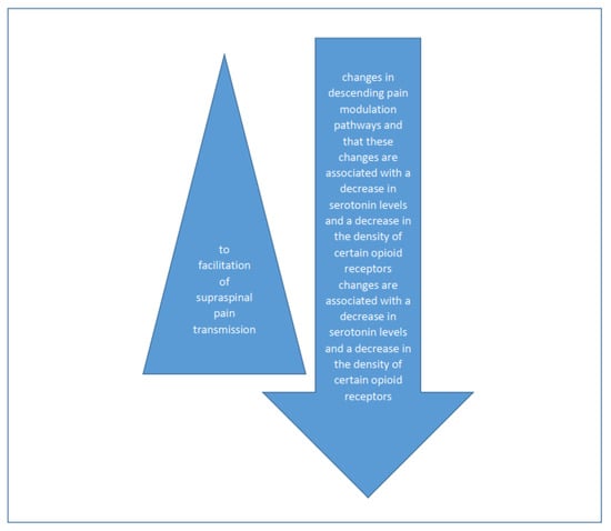 The pathophysiology of medication-overuse headaches (MOHs) is not fully understood. In addition to factors related to previous headaches, psychological factors, personality traits, and a genetic predisposition play important roles [26,27] (Figure 1). Genes involved in complex processes of endogenous pain modulation, drug metabolism, and the serotonin and dopamine systems have been linked to the development of MOH [28]. Excessive use of analgesics leads to facilitation of supraspinal pain transmission [29] (Figure 2). Functional neuroimaging studies have revealed structural and functional abnormalities in various structures responsible for processing painful stimuli and in structures that provide the neurobiological basis of affective and addictive behaviors, such as the mesolimbic system [30] (Figure 1). While cessation of excessive medication use leads to a loss of these changes in some patients, they persist long-term in others. This is understood as a kind of predisposition to the development of medication overuse [31]. Experimental studies have shown that excessive use of medications to treat migraine leads to changes in descending pain modulation pathways and that these changes are associated with a decrease in serotonin levels and a decrease in the density of certain opioid receptors [32]. There are numerous experimental, genetic, structural, and functional neurovisualization and electrophysiological studies addressing the pathophysiology of medication-overuse headache (MOH). Experimental studies have shown that chronic exposure to sumatriptan leads to a reduction in the stimulus threshold and a sustained increase in the likelihood of cortical depolarization [33,34,35]. Increased production of CGRP, substance P, and NO in the trigeminal ganglion has been demonstrated in MOH [36,37], characterized by a reduction in the nociceptive threshold and inhibitory mechanisms [38]. Chronic use of analgesics leads to increased neuronal excitability in the amygdala complex, which may explain the occurrence of anxiety and depression in MOH [39]. In MOH, the activity of the serotonergic pain modulation system is impaired, with reduced production of serotonin in the CNS and increased expression of the pronociceptive serotonin receptor (5HT-2A) [40,41,42]. In animal models, increased expression of 5HT-2A receptors on platelet membranes and decreased serotonin concentration in these cells have been demonstrated with excessive use of analgesics [43] (Figure 2).