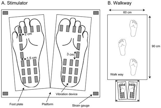 Vibration devices, foot plates, a platform under the feet (A), and a walkway in front of the stimulator (B).