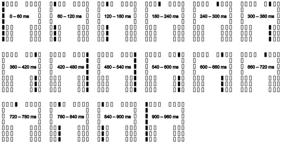 The participants maintained quiet stance on the foot plates. The feet position was finely adjusted in each trial so that all the vibration devices were under the sole. Each trial lasted for 15 s. A sound cue was provided at the beginning of the trial, and the participants initiated gait at their preferred time within the time window of each trial and made three steps forward to the end of the walkway with their preferred velocity. The initial swing leg of the gait initiation was freely chosen by the participants in each trial. One of two conditions, gait initiation with (stimulation condition) and without stimuli to the sole (non-stimulation condition), was assigned in each trial. In the stimulation condition, the LMTS were given throughout the time window of the trial. The duration of each vibratory stimulus provided via the devices was 60 ms. The cycle duration of the LMTS was 960 ms, mimicking the cycle duration of the gait cycle, which is approximately 1 s [21]. The loci of the stimuli moved from the left- to right-most position of the sole and then moved from the right- to left-most position of that with 960 ms of one stimuli cycle, and this cycle was repeated 16 times (Figure 2). Thus, the stimuli lasted for 15 s. The stimuli were not given in the non-stimulation condition. Twenty trials were conducted for each condition. Taken together, 40 trials were conducted in each participant. One of the two conditions (stimulation and non-stimulation conditions) was randomly assigned in each trial. To achieve this, 40 random numbers were generated, and one of the two conditions was assigned to each random number, and then, the number was ordered from small to large. This ascending order of the random numbers generated was considered the order of the trial.